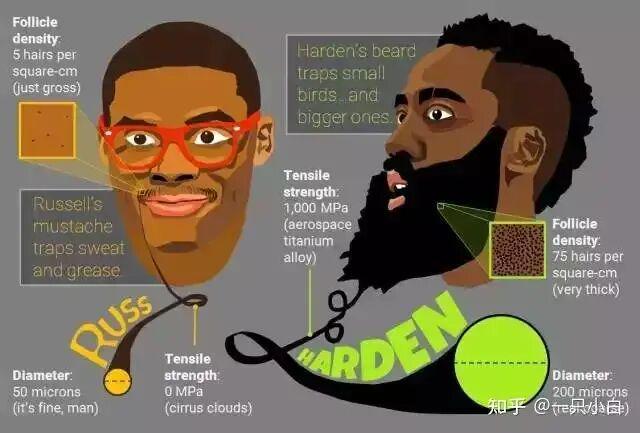 詹姆斯哈登实属当今NBA胡子最长的人,在国外的研究中表明哈登的胡须处毛囊密度为一平方厘米75个毛囊,直径200微米,其抗拉强度 高达1000Mpa,用人们身边的物质来说,哈登的胡须强度相当于航空航天的钛合金 哈哈哈哈哈哈也怪不得在比赛中常有碰胡子犯规这一说而哈登的二哥威少也荣获提名,威少的毛囊密度为5直径50
