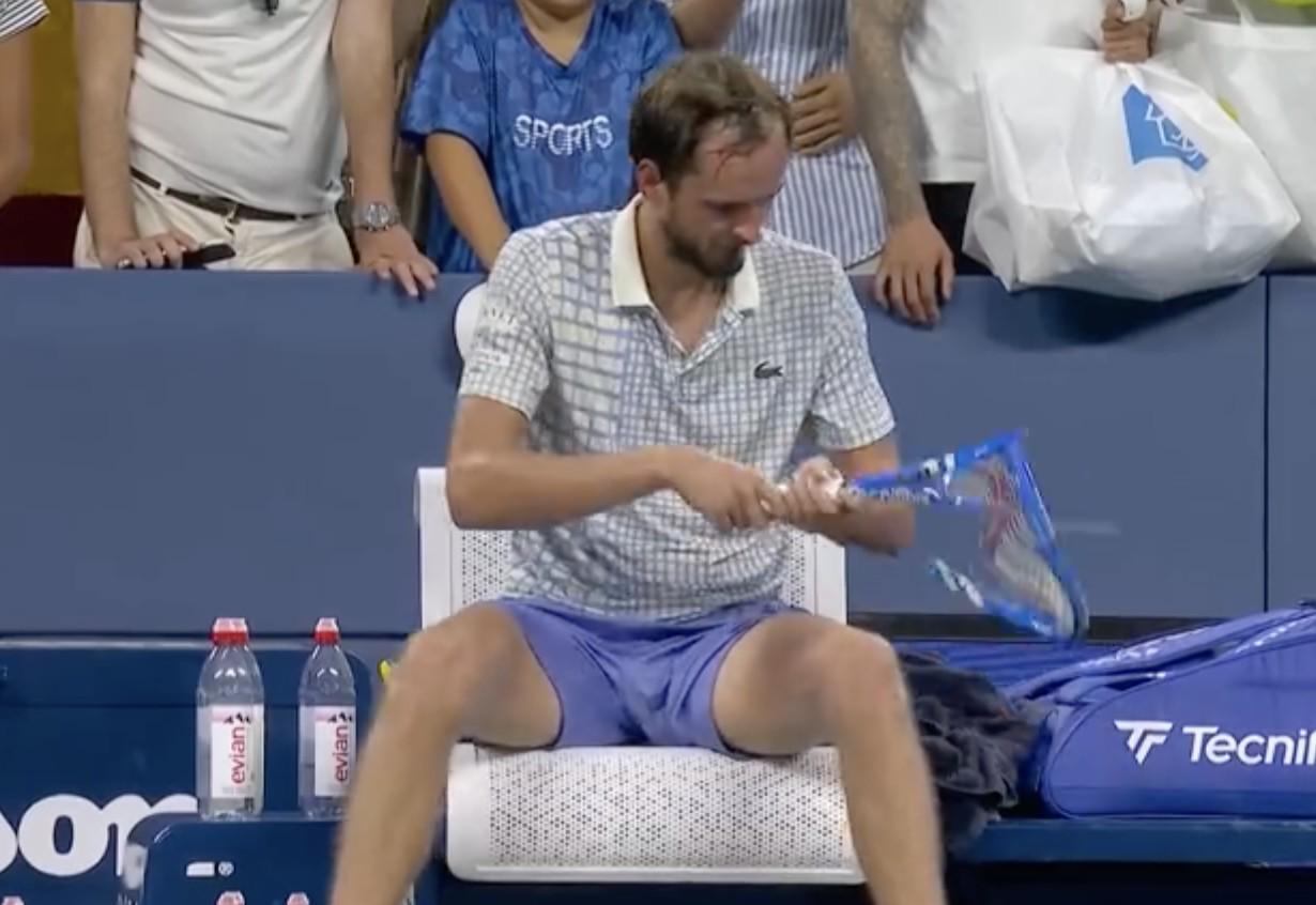 8月25日,美网男单首轮,2021年赛会冠军、13号种子梅德韦杰夫2-3不敌邦齐,止步美网单打首轮。赛后,梅德韦杰夫怒砸球拍十余下,直至彻底砸烂。